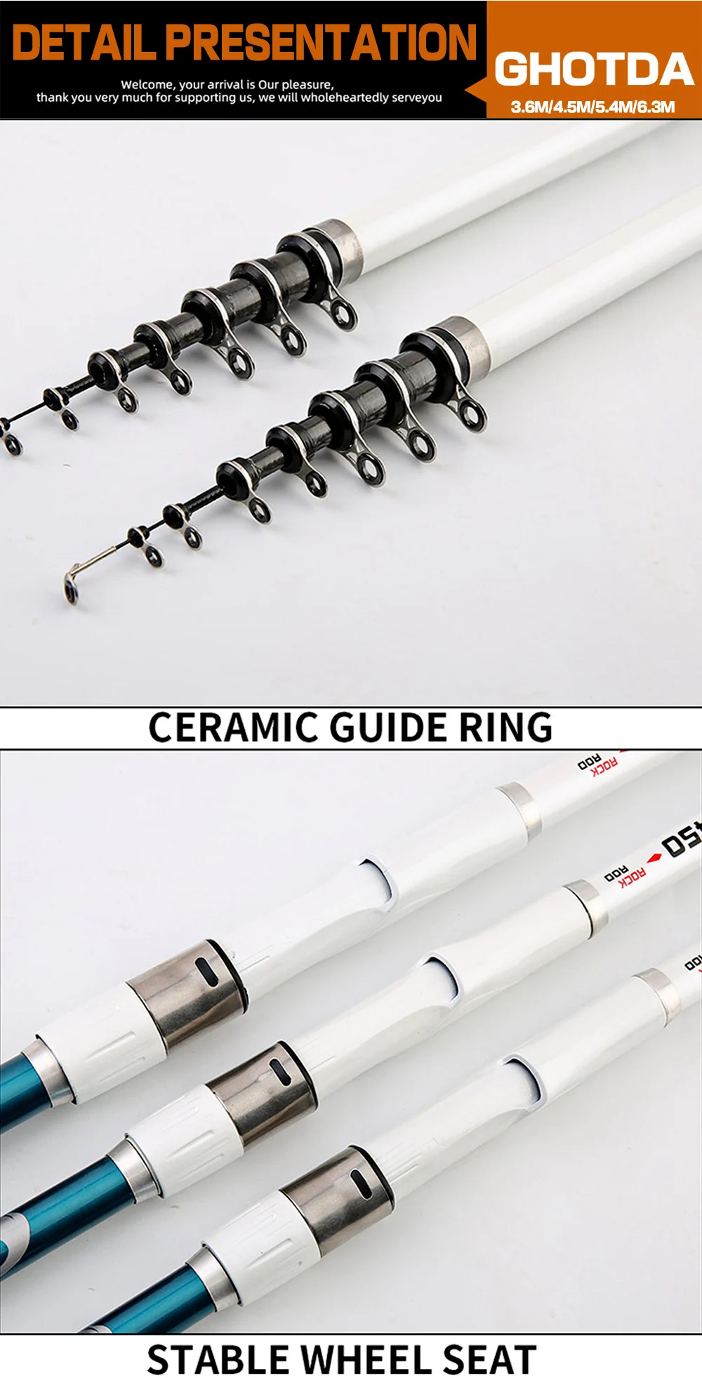 Ceramic Guide Eye, so it is smooth and no damage to your fishing line. And it equipped with a movable guide ring to prevent the tip breaking.